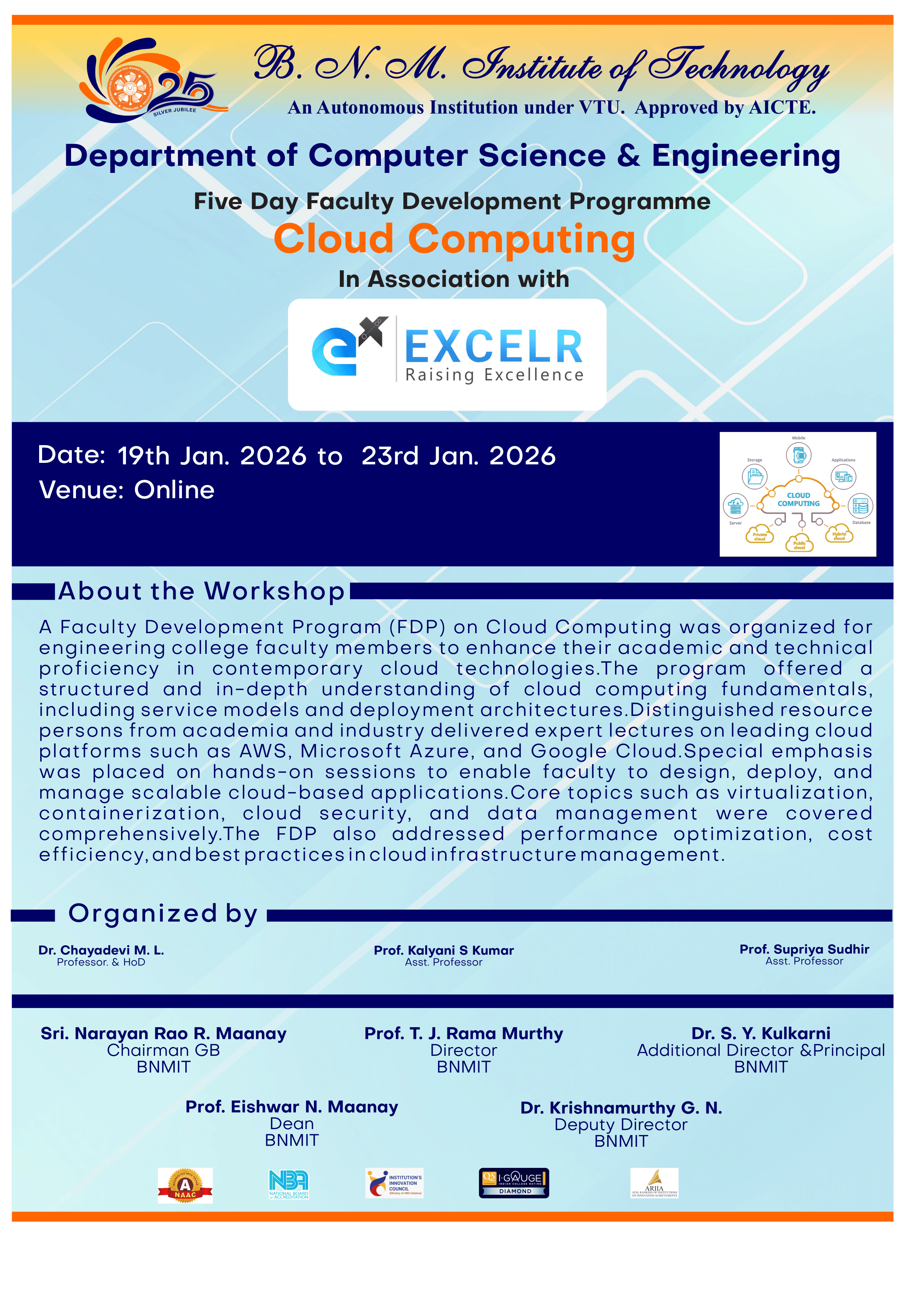 A Faculty Development Program (FDP) on Cloud Computing was organized for engineering college faculty members to enhance their academic and technical proficiency in contemporary cloud technologies.The program offered a structured and in-depth understanding of cloud computing fundamentals, including service models and deployment architectures.Distinguished resource persons from academia and industry delivered expert lectures on leading cloud platforms such as AWS, Microsoft Azure, and Google Cloud.Special emphasis was placed on hands-on sessions to enable faculty to design, deploy, and manage scalable cloud-based applications.Core topics such as virtualization, containerization, cloud security, and data management were covered comprehensively.The FDP also addressed performance optimization, cost efficiency, and best practices in cloud infrastructure management