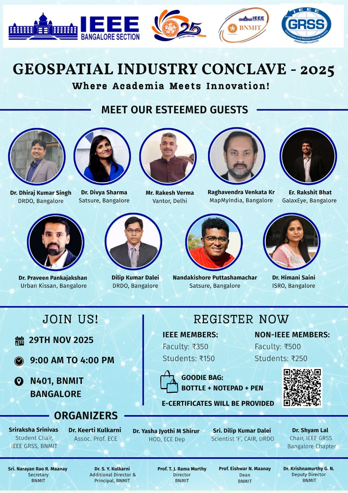 The Department of Electronics & Communication Engineering, in association with IEEE Bangalore Section, IEEE BNMIT, and the IEEE Geoscience and Remote Sensing Society (GRSS) Student Branch Chapter, organized the Geospatial Industry Conclave – 2025, a flagship event aimed at bridging academia with rapidly evolving geospatial and remote sensing industries.