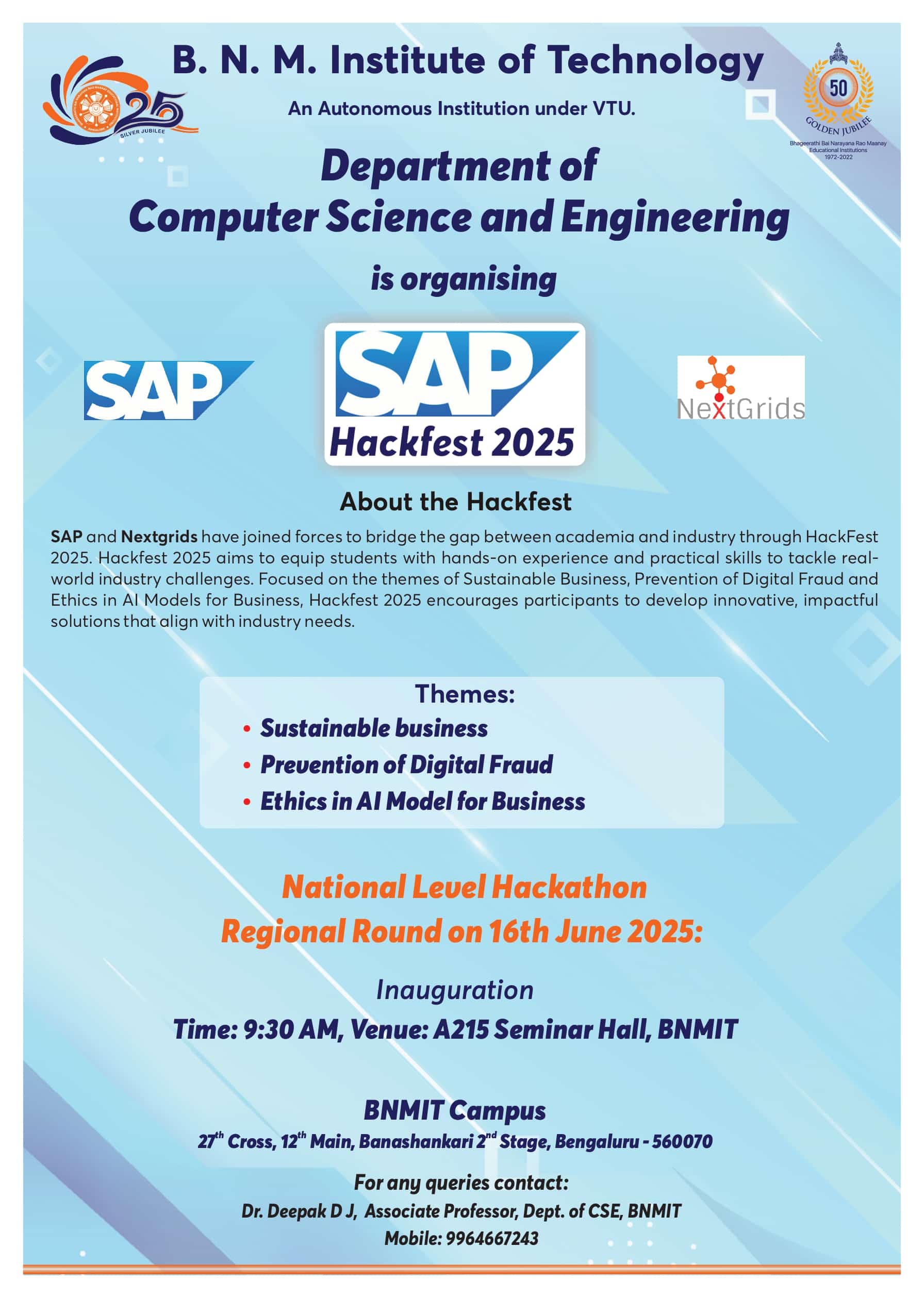 The regional round of SAP Hackfest 2025 was organised by SAP and Nextgrids in collaboration with the Department of CSE, BNMIT on 16th June 2025 at BNMIT campus.