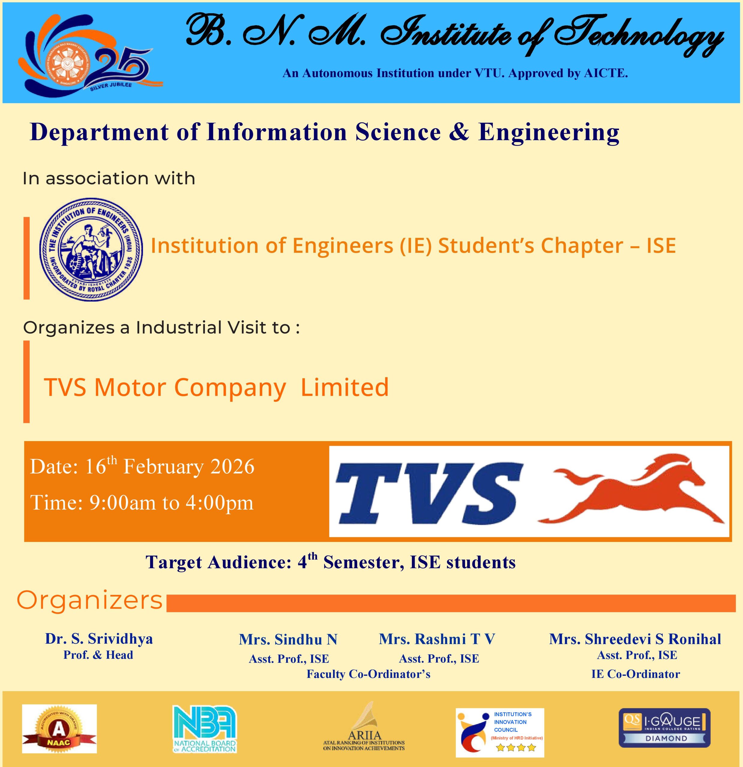 Organized an Industrial visit to “TVS Motor Company Limited” in association with IE on 16 FEB 2026, 9am-4pm