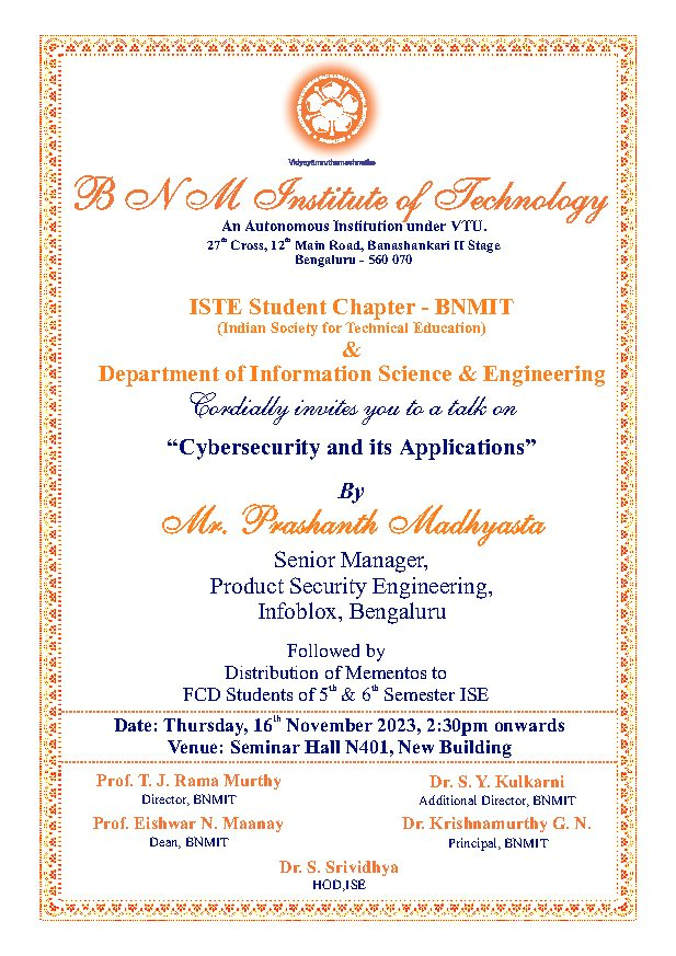 Talk on Cybersecurity and its Applications Conducted By : ISTE Student Chapter – BNMIT and Department of ISEResource person : Mr. Prashanth Madhyasta + Add to Google Calendar + iCal / Outlook export
