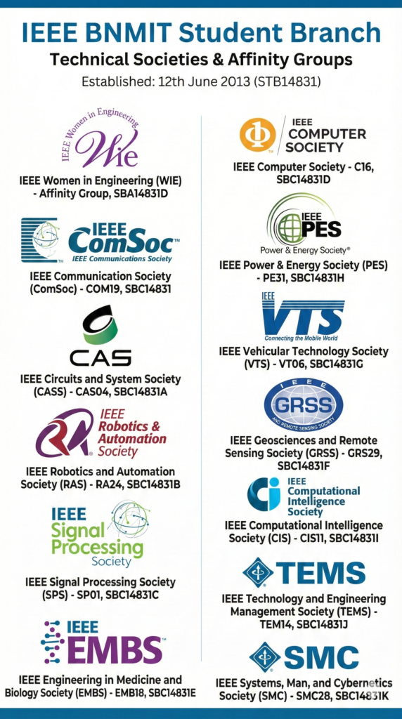 Furthermore, BNMIT hosts flagship conferences and fosters professional development by actively associating with esteemed professional bodies across various departments. A testament to this initiative is the IEEE-BNMIT Student Branch, which was started on 12th June 2013 (Approval Code: STB14831). These collaborations enable students to participate in technical events, networking opportunities, hackathons, conferences, and certification programs, which enhance their academic and career prospects. By engaging with these professional organizations, students gain valuable insights, build industry connections, and develop the skills required to excel in their respective fields.